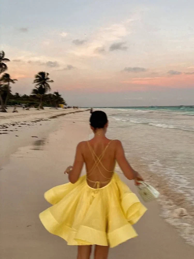 Step into the spotlight with this stunning dress that blends daring style and refined charm. Featuring an eye-catching open back with striking lace-up details, it offers an irresistible appeal. The high waist and pleated hem create a flattering A-line shape that enhances your figure beautifully. In a vibrant yellow shade, this dress ensures you stand out effortlessly at any event.