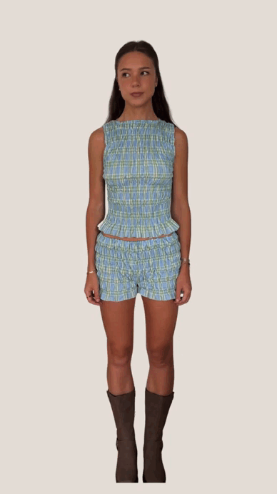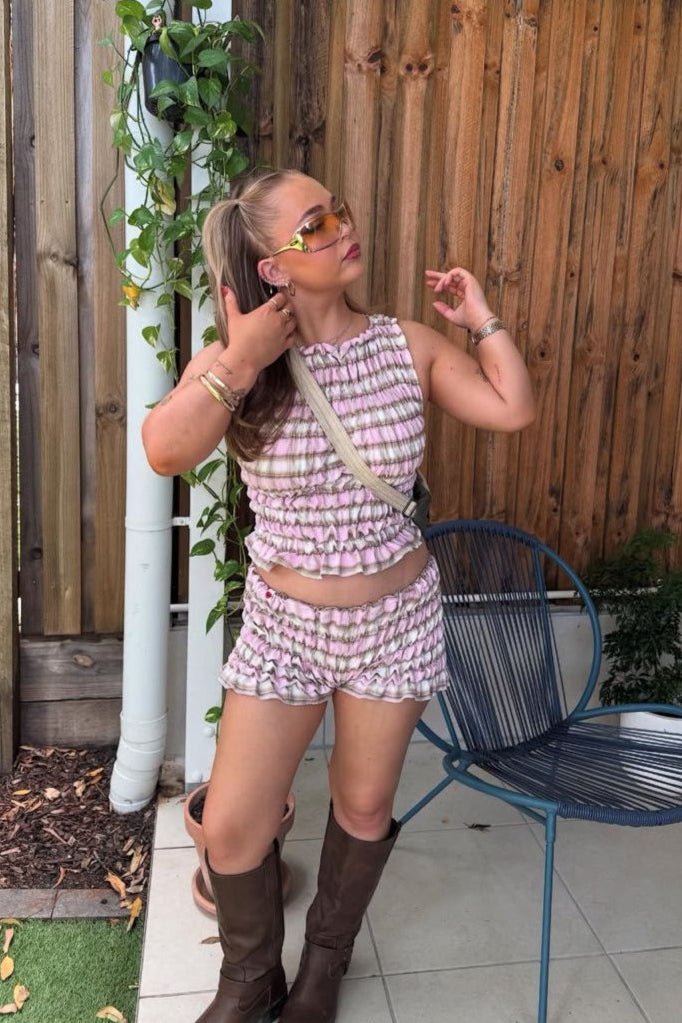 This two-piece set brings playful charm with every detail. Featuring a pleated ruffle crop top and matching low-rise bottoms, it’s designed for carefree moments that still make a statement. Light, flirty, and full of personality — just the way you like it.